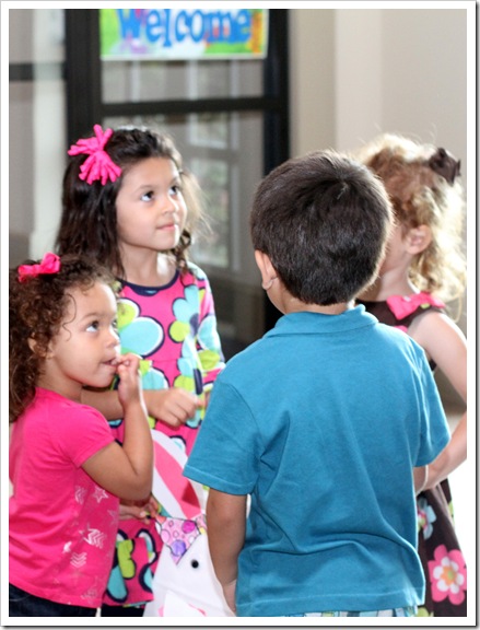This is the class (B is hiding behind Mrs. York), listening to directions before hunting for eggs. Each student was assigned a number that was written on the bottom of his/her bag. Parents sent in eggs numbered 1-13 (number of students in the class). It was a really cute idea and it ensured that each child get the same number of eggs total. Two friends were absent so Mrs. York collected their eggs. ANYWAY, it was so dang cute to see all the kids running around hunting for eggs!